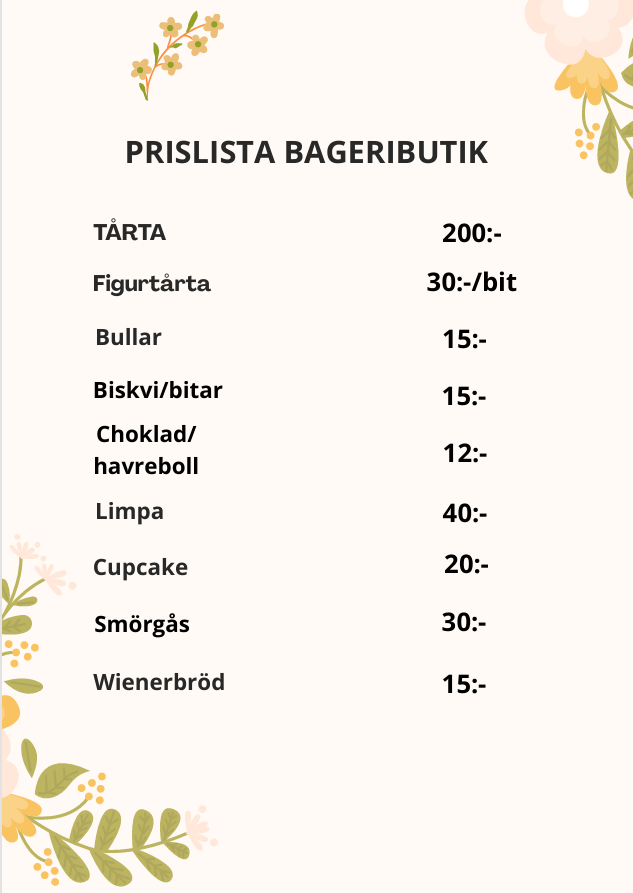 Det går också bra att beställa från oss i mån av tid och ju tidigare ni hör av er, desto lättare är det för oss att tacka ja till er beställning. Vårt utbud varierar utifrån vad eleverna arbetar med just nu, men önskar ni något särskilt får ni gärna fråga. Ni hittar en del av det man kan beställa i vår prislista nedan.